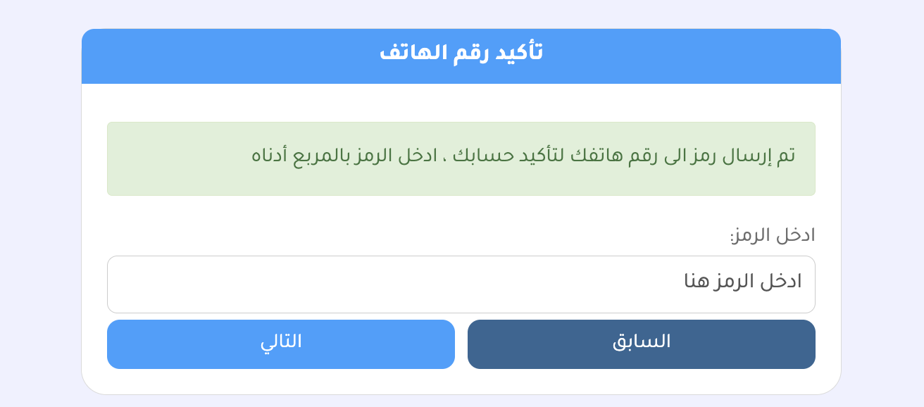 والان بعدما ادخلنا المعلومات نضغط على التالي وستظهر لنا الصفحة التالية حيث تم إرسال رمز تحقق الى رقم هاتفك التي قمت بتسجيله ويجب ان تقوم بادخال الرمز بالمربع أدناه.