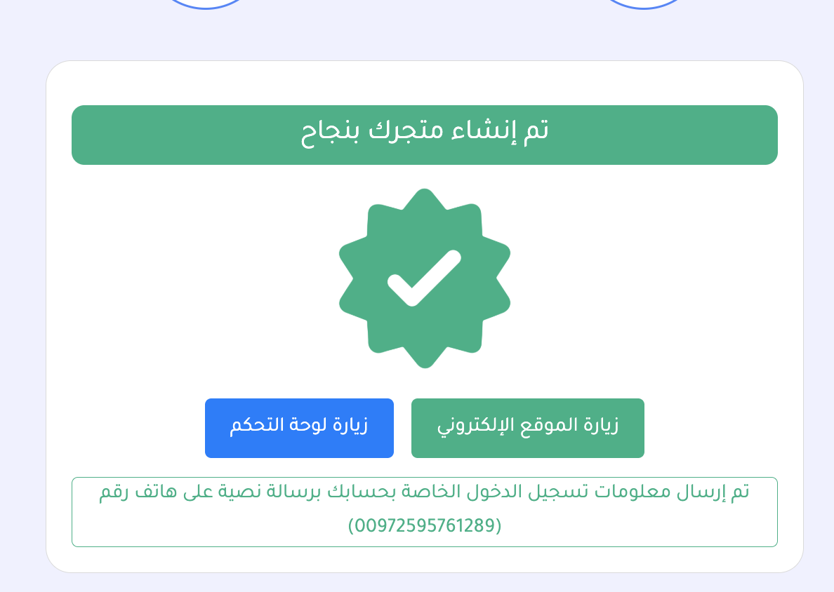 وبهذا تم إنشاء متجرك الإلكتروني بنجاح وبهذه اللحظة سيتم إرسال لك رسالة SMS لمعلومات متجرك الإلكتروني وتفاصيل الدخول على متجرك الإلكتروني وايضا ستصلك بعد فترة رسالة واتساب بكل تفاصيل دخول متجرك الإلكتروني بالإضافة الى انه في هذه الصفحة يمكنك ان تضغط على زيارة الموقع الإلكتروني وزيارة لوحة التحكم وادخال المعلومات ، الان نرى المتجر الإلكتروني الخاص بنا بعدما قمنا بإنشائه